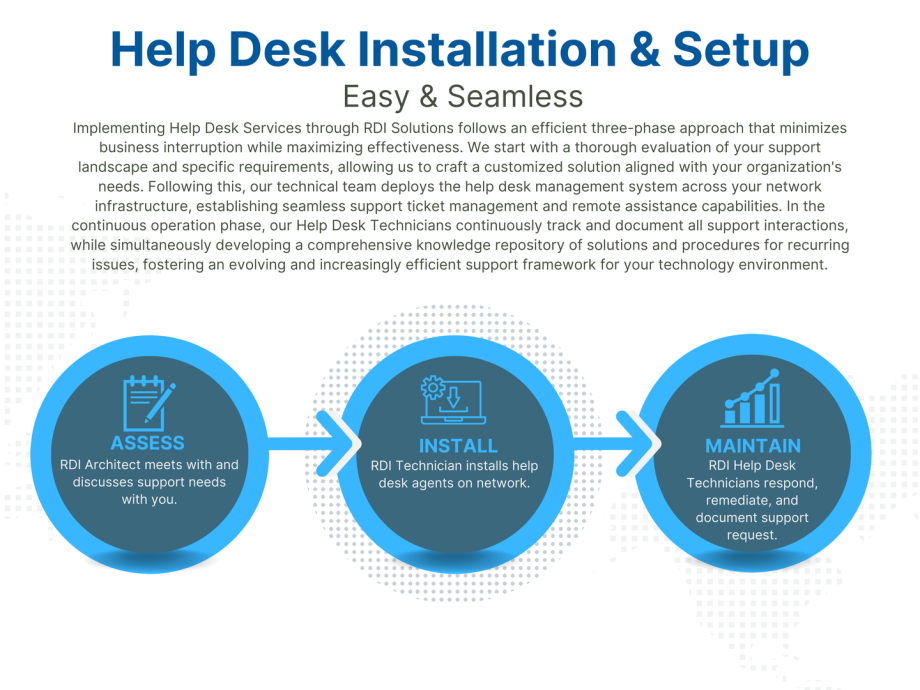 Through RDI's Help Desk Services, organizations gain access to a partner dedicated to your success. Our solution encompasses 30 second support request response time, predictive maintenance protocols, and resource utilization analysis for optimal performance. We implement streamlined workflow automation, process standardization, and quality assurance measures to achieve operational excellence. Our security enhancement features include zero-trust security architecture, comprehensive compliance management, and regular vulnerability assessments to maintain the highest levels of data protection.
