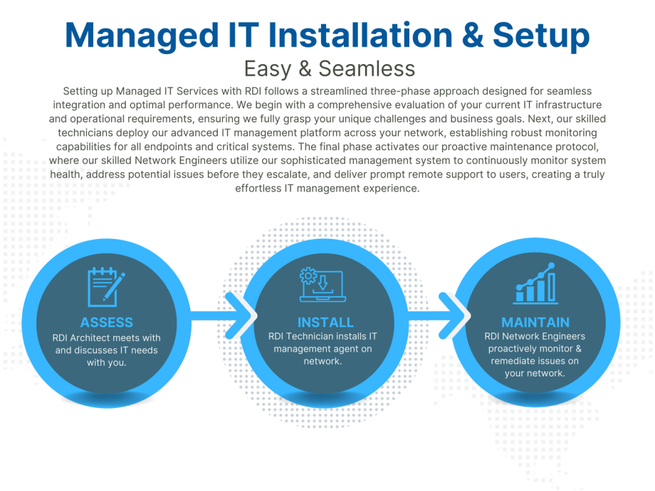 The cornerstone of our service is our commitment to continuous improvement and innovation. Our support technicians regularly undergo rigorous training and maintain industry certifications to stay ahead of emerging technologies and threats. We work closely with each client to understand their unique needs and challenges, developing customized solutions that not only meet current requirements but also anticipate future growth. Whether it's implementing new security measures, optimizing network performance, or providing help desk support, RDI's Managed IT Services delivers the expertise, reliability, and scalability needed to drive your business forward in today's technology-dependent landscape.